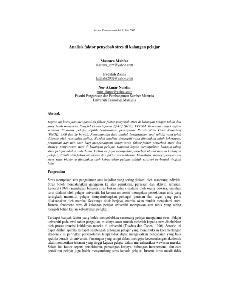 Kurangnya program persediaan pengurusan stres serta kemahiran daya kajian stres dalam kalangan pelajar guru di institut pendidikan guru kampus pulau pinang. Objektif kajianpeningkatan masalah stres di kalangan pelajar yang semakin meningkat perlu diambil perhatian. Apa penyebab stres di kalangan pelajar? January 7, 2013 by dewia. Dalam masa pubertas yang dialami remaja, banyak perubahan yang terjadi dalam diri remaja baik secara fisik maupun psikologis.